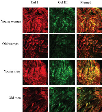 Figure 2: Polarized light microscopic pictures showing collagen types I and III, and merge of green and red proteins in young and old age of women and men.