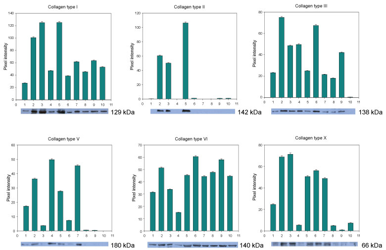 Figure 4: Western blot analysis of collagen types I, II, III, V, VI and X in TCL tissues. Results are represented as mean ± standard error of the mean.