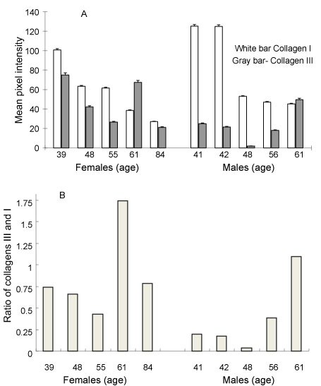 The use of PSR to differentiate between the different collagen types in tissue was originally described by Junqueira, et al. [22]. Observations show that PSR stains pure collagen strongly, without staining other proteoglycans, with a simple, reliable, and inexpensive technique. Collagen fibers show up in bright colors contrasted against a black background. Type I collagen, formed from thick fibers composed of closely packed fibrils, exhibits an intense red or yellow birefringence. Type III collagen forms thinner fibers, of loosely disposed fibrils with weak green birefringence. Significantly greater amounts of type I collagen fibers were found in men compared to women, and significant differences in the quantity of type III collagen were found between women and men. We found a reduced renewal rate for collagen type I and an increased rate for type III, with increasing age in both genders. Three potential explanations for these findings can be considered: (i) Both the fibroblast numbers and the rate of collagen formation decreased with age; (ii) Rate of collagen production decreased whilst the fibroblast numbers remained constant; or (iii) The number of fibroblasts decreased but the rate of collagen formation was stable. Regardless of the mechanism, these observations allow us to conclude that the formation of collagen fibers decreased with increasing age.