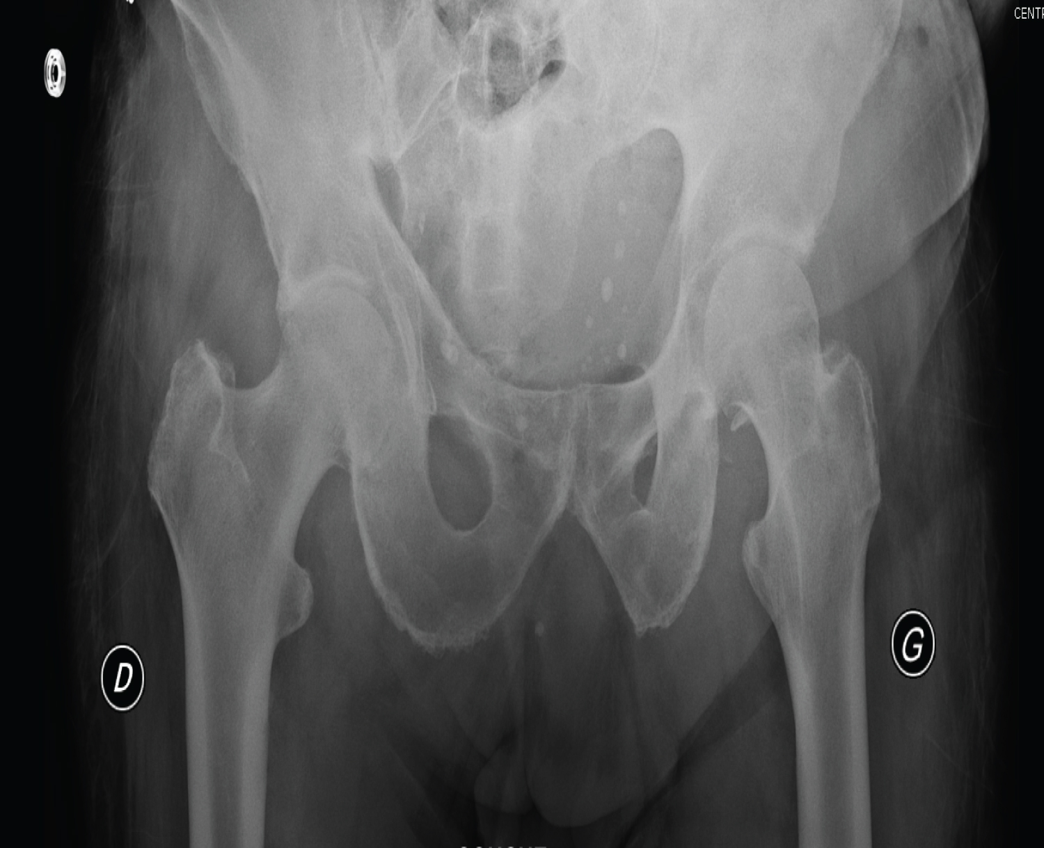 The radiographic assessment objectified a posterior dislocation of the left hip, and anterior on the right side, with no visible acetabular or femoral fracture (Figure 1). A CT scan of the pelvis was requested urgently which objectified a posterior dislocation of the left hip, and anterior on the right, without acetabular or femoral fracture, nor visible intra-articular foreign body (Figure 2), So it is a divergent bilateral dislocation of the two hips.