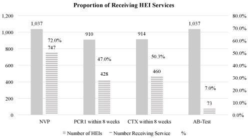 Our study indicated a low use HEI services in Cambodia. Of all HEIs, 72.0% received NVP, 47.0% had PCR1, 50.3% received CTX and 7.0% had AB-Test. These data suggest three important findings: