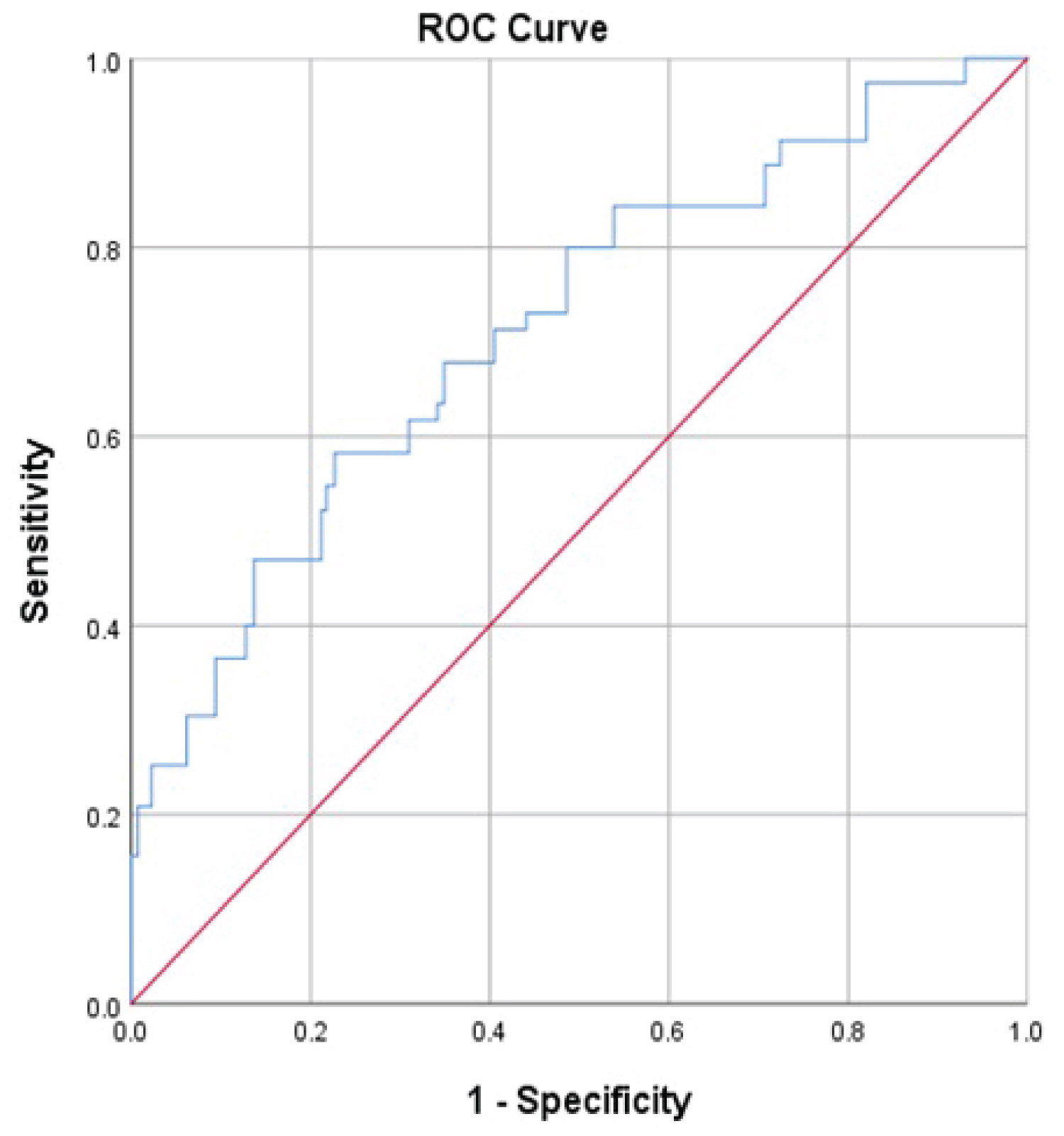 The risk scores of each participant alongside the hypertension status were used to generate a receiver operating characteristic curve (ROC) and the area under the curve (AUC). We equally had a table of sensitivity and 1-specificity data. The sensitivity and specificity scores were summed together for each participant and the sum with the highest score was used to extrapolate the sensitivity, specificity and optimal cut off value for the model [14]. Thus, the Sensitivity, Specificity, Optimal cut-off value for the predictive risk-score model and AUC/c-statistic were 80.0%, 60.0%, 404 and 0.701 (95% CI 0.624-0.784) respectively with the derivation dataset (Figure 3). The larger the ROC curve in the upper left corner, the better the discriminatory power of the curve. The AUC was 0.701 (95% CI 0.624-0.784) and was significantly discriminatory given that the lower limit confident interval was greater than 0.5. Using a contingency table, the positive predictive value (PPV) and negative predictive value (NPV) for the development or derivation model was calculated and were 32.4% and 92.6% respectively. The positive and negative likelihood ratios (how much the odds of a disease changes with a given test) were 2.0 and 0.3 respectively (Table 4).