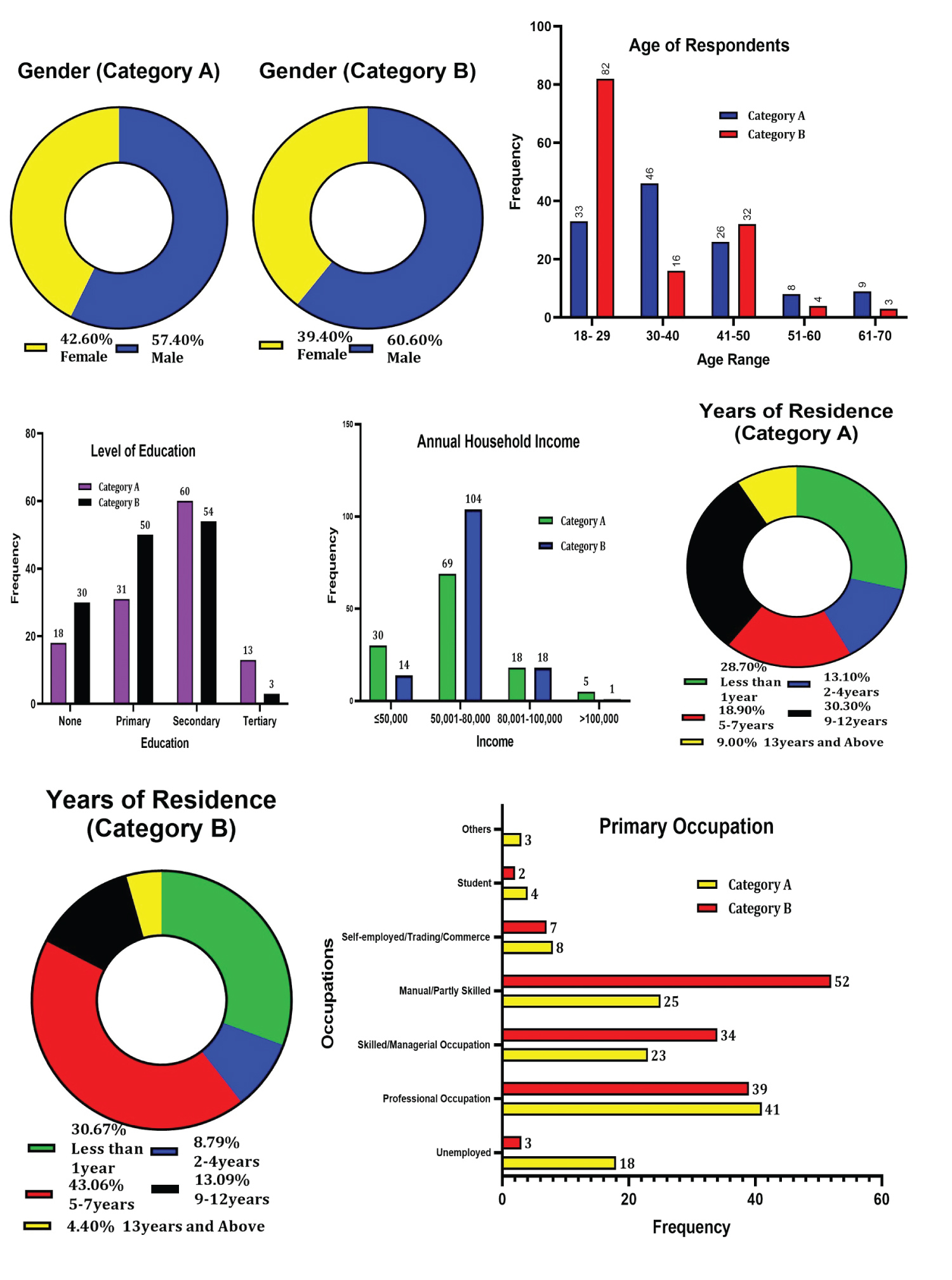 The socio-demographic details of the respondents from category A (250 m radius of the landfill) and category B (500m radius of the landfill) were presented in Figure 1. As indicated, most respondents were male (57.40%) and (60.60%) for categories A and B, respectively. Most respondents are within the age range of 30-40 (37.71%) for category A and 18-29 (59.85%) for category B, with both having majorly secondary level education (49.18%, 39.42%). The survey observed that most respondents from both groups earn monthly income ranging from 50,000-80,000 NGN, while respondents in category A have been the residence of the location for about 9-12 years (30.58%), and category B has most respondents' years of residency for about 5-7 years (43.07%). Regarding the primary occupation, the category A respondents primarily engage in a professional occupation (32.79%), while category B mainly engages in a manual/partly skilled occupation (37.96%).