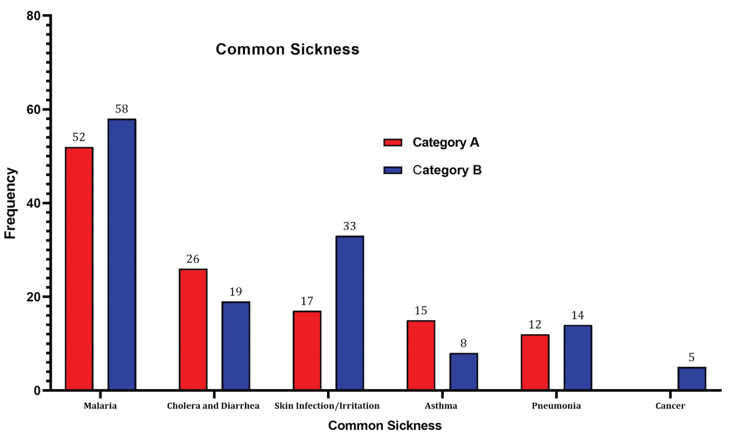 For category A respondents, the most common sickness based on the survey was malaria (52-42.6%), followed by cholera and diarrhea (26-21.3%), skin infection/irritation (17-13.9%), asthma (15-12.30%), and pneumonia (12-9.8%). Similarly, malaria (58-42.3%) was observed to be the most common sickness among category B households, which is followed by skin infection/irritation (33-24.1%), cholera and diarrhea (19-13.9%), Pneumonia (14-10.2%), Asthma (8-5.8%) and cancer (5-3.6%) as shown in Figure 2.