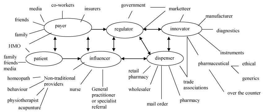 Interviews have been conducted over the past fifteen years with pharmaceutical professionals in Europe, USA, Asia, Africa and Australia. Considerable time has been spent over the past three years in major human teaching hospitals, university medical faculties and medical practices analyzing the interactions from the time the patient seeks treatment to the time it is dispensed and the factors which influence this. The system of healthcare delivery has been broken into its component parts and modeled to better understand their transactional nature, similarities and differences and opportunities. This paper represents a synthesis of findings with an analysis of the interplay between the participants in healthcare and the way decisions are influenced during the course of daily healthcare provision.