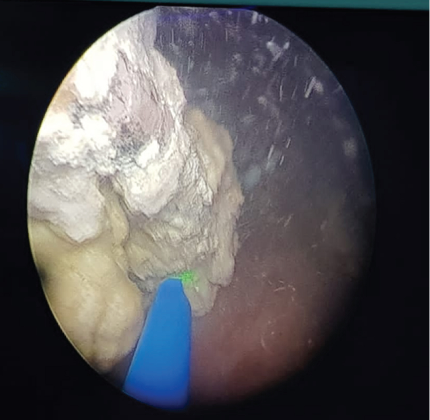 Biologically, an infectious syndrome is associated with renal failure. Capillary blood glucose was 3.2 mg/dl with 7% glycated haemoglobin. The emergency procedure was the setting up of a bilateral nephrostomy, antibiotic therapy, rehydration and glycemic control. At a distance from the acute episode, a laser fragmentation (Figure 2) of the intra bladder and ureteral calcification was first performed and then a pyelolithotomy for extraction of the encrusted renal stones with double J stenting (Figure 3).