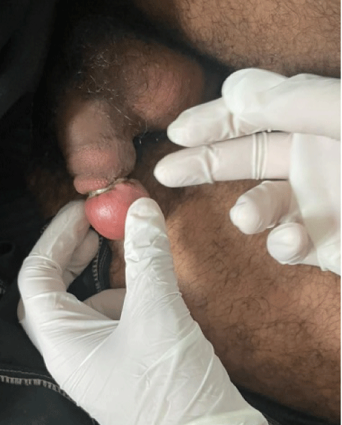The patient reported unsuccessful attempts to remove the ring using soap and oil. He had no history of substance abuse. Clinical examination revealed a wedding ring encircling the coronal sulcus, accompanied by mild edema and congestion of the glans. The patient, who was already circumcised, exhibited a foul odor, desquamation beneath the metal ring, and irritation, though there were no signs of necrosis or skin breakdown due to the strangulation effect (Figure 1). There was no black discoloration or evidence of necrosis of the distal penile shaft, and no signs of a retro-cutaneous fistula. Urinary output was preserved, with no symptoms of dysuria or acute urinary retention (AUR).