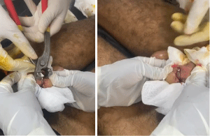 One of the main challenges was the unavailability of specialized cutting tools. As a result, a sterilized cutting plier was used under short-term sedation to successfully remove the ring (Figure 2). No deep tissue damage was observed. Following removal (Figure 3), immediate penile decompression was achieved.