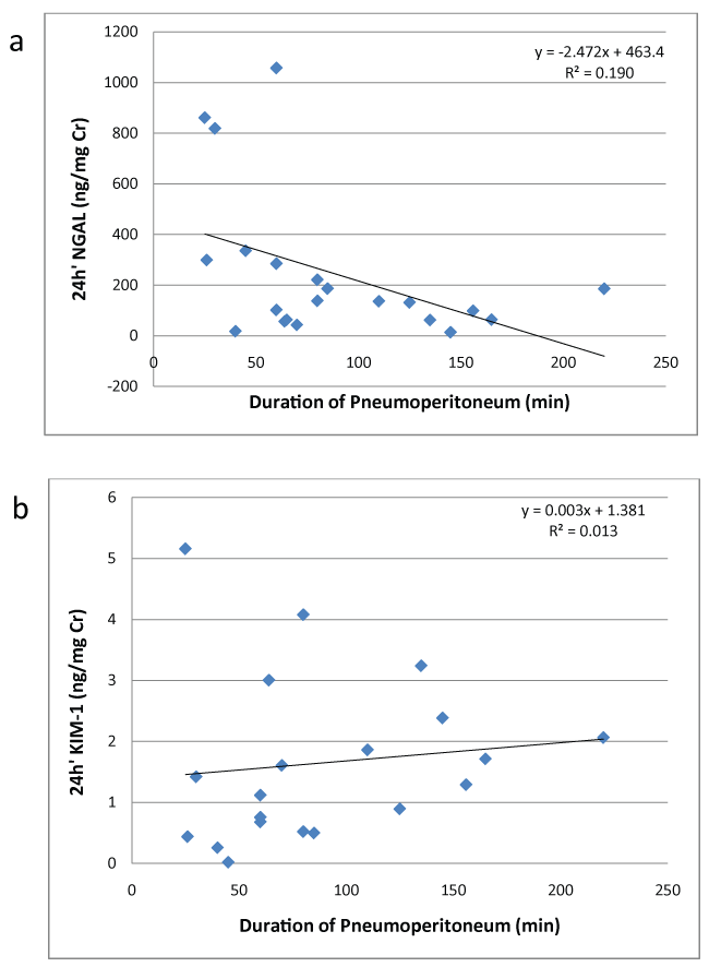 Figure 1: Correlation between the duration of pneumoperitoneum and the post-operative urinary levels (a) NGAL; (b) KIM-1. View Figure 1