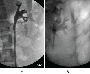 Figure 1a: Left retrograde pyelogram demonstrating filling defects in renal pelvis, lower pole and mid pole calyces. Case 1-EC.