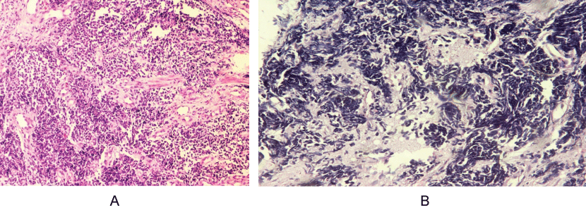 Figure 1: A) Tumor cells are arranged in sheets and clusters and are invading the muscle fibres (H&E, 40X).