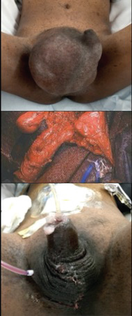 The patient underwent surgical excision of the penile mass. The mass originated from the right penile neurovascular bundle, invaded the right corpus cavernosum, and draped over the dorsal penis to surround the left neurovascular bundle as well. It invaded the symphysis pubis and pelvic floor muscles. The urethra and bilateral spermatic cords were spared. The right neurovascular bundle was sacrificed, along with a portion of the tunica albuginea of the right corpus cavernosum. Margins were negative on the symphysis pubis and pelvic floor, but total penectomy would have been necessary for negative margins on the penis. Given the patient's comorbidities, maximum excision of the tumor for palliation while maintaining minimum penile anatomy was performed with right erectile body reconstruction and scrotoplasty (Figure 2).