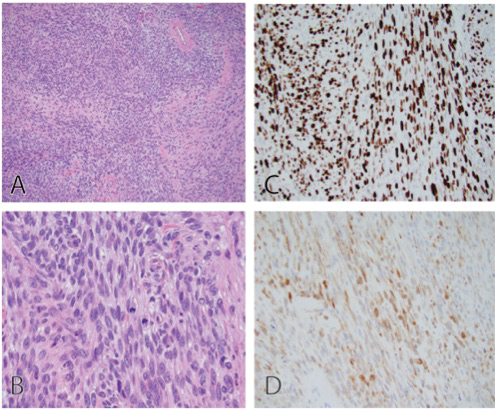 Histopathological and immunohistochemical staining were consistent with a high grade MPNST (Figure 3) Tumor cells were present at the resection margins and tumor necrosis was estimated at 10%. The lymph nodes were not assessed, however no lymphovascular invasion was noted.