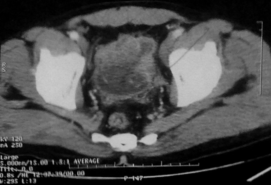 A pelvic Ultrasound revealed a large mass measuring 7 × 5 cm, from lateral right wall of the urinary bladder with no evidence of calculi. Contrast-enhanced computed Tomography Scan confirmed the anatomical location of the mass along with involvement of the adjacent musculature (Figure 1).