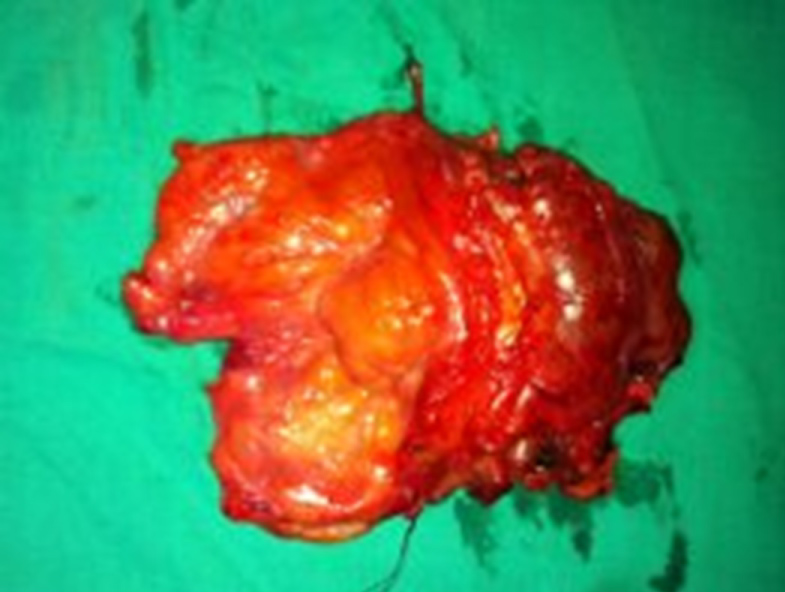Figure 2: Gross examination: Tumor measured 10 × 8 × 5.5 cm, invades urinary bladder and parenchyma of prostate.