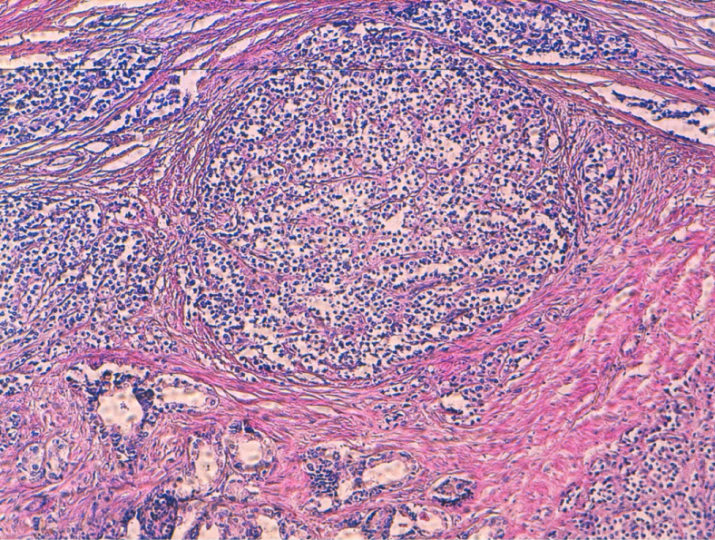 Mitotic figures and nerve invasion were frequent. Tumor invaded complete wall of urinary bladder, the prostatic parenchyma and the seminal vesicles. The neoplastic cells on immunohistochemistry exhibited Chromogranin A and focal cytokeratin positivity and were negative for synaptophysin and CD56.