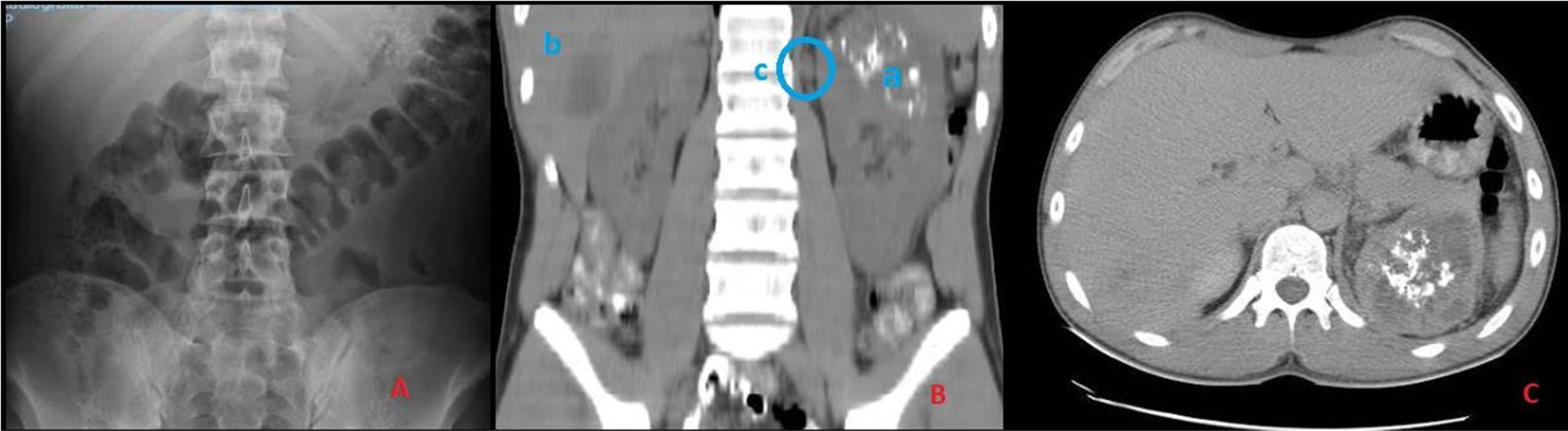 The abdominal X-ray showed a heterogeneous, calcified, poorly delimited image of 5 cm in the left hypochondrium (Figure 1). Tumoral markers, and hepatic-renal profiles were normal on blood test. CT scan showed a heterogeneous and calcified left renal mass, sized 12 × 7.6 cm, dependent on the upper pole, with no vascular invasion. Left hiliar and para-aortic adenopathies, up to 3 cm were also reported. Moreover, a 4 × 3.6 cm hypodense lesion in the 6th hepatic segment, and another one, 12 mm, in the hepatic dome, compatible with metastasis, were described (Figure 1).