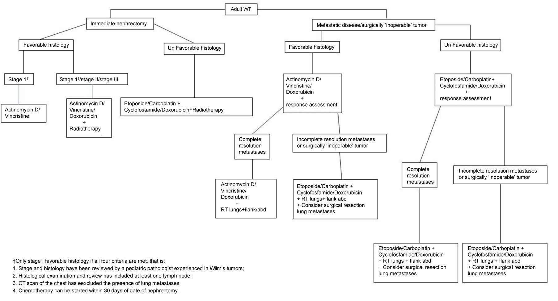 Figure 3: Therapeutic algorithm, proposed by the SIOP and COG, in adults with Wilms tumor according to the performance of previous nephrectomy and the prognostic group [3].