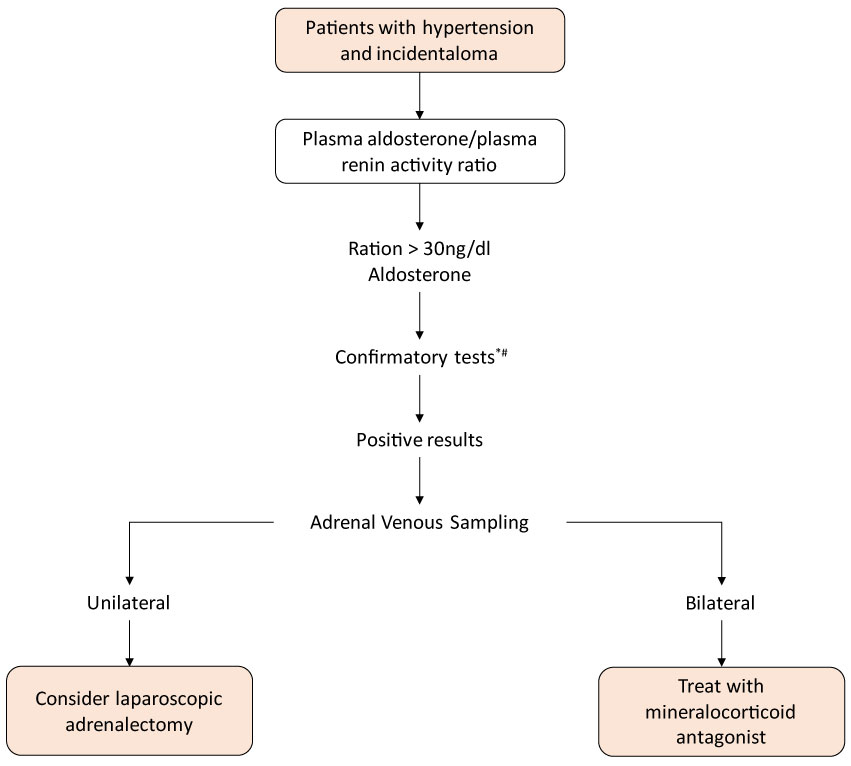 Figure 3: Algorithm for the investigation of Hyperaldosteronism in Adrenals Incidentalomas. *Most commonly used Confirmatory tests: Oral sodium load test, intravenous saline infusion test.