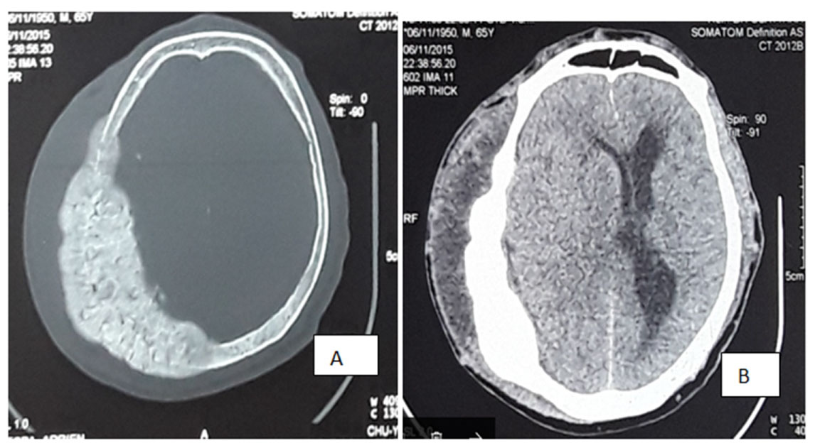 Mr. B.C, is a 66-years-old man who presented to Neurosurgery Department with swelling in the left parietal region. Subsequent evaluation revealed high PSA level of 9,202 ng/ml which warranted referral to urology unit. The swelling noticed about a year prior to presentation. It was painless and slowly increasing in size. There was no neurological or lower urinary tract symptom (LUTS). Physical examination revealed a left firm, non-tender parietal mass. The scalp and hair appears normal. Digital rectal examination revealed enlarged, hard and nodular prostate. Renal function was normal. Prostate biopsy showed adenocarcinoma, Gleason score 6 (3 + 3). Computed Tomography (CT) of the skull showed a left well-circumscribed parietal mass with bony exostosis inside and outside the skull. The overlying and underlying structures were normal (Figure 1). Bone scintigraphy showed areas of high radioactive absorption at the level of the parietal mass, as well as the left humeral head and the ribs. The patient underwent androgen privation therapy using Cyproterone 300 mg/day because he cannot afford more appropriate treatment (LHRH analog, Abiraterone, chemotherapy). He had regular follow up, the lowest PSA recorded was 3 ng/ml after 8 months of treatment. The parietal swelling has reduced in size. At 18th month of treatment, the PSA level rose to 102 ng/ml and the serum Testosterone was 0.1 ng/ml. The general condition of the patient gradually deteriorated and he died few months later.