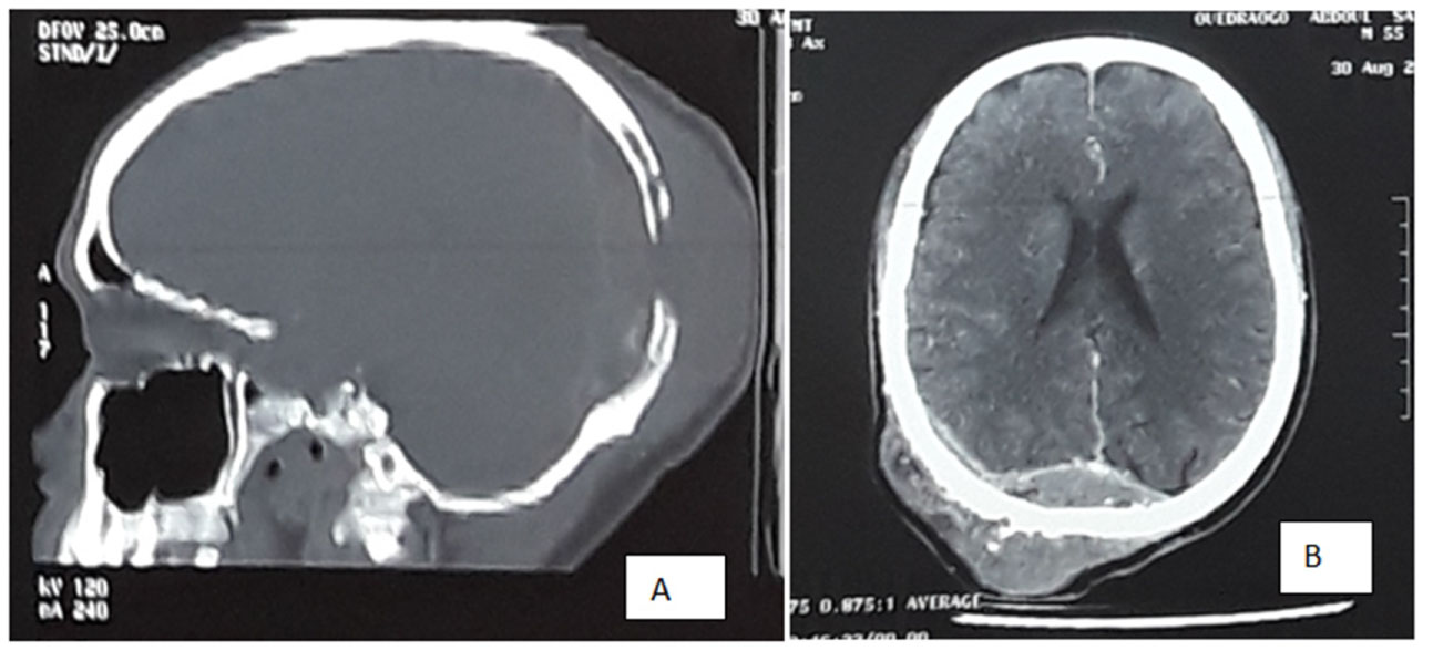 Figure 1: Brain CT showing osteoblastic mass of the cranial vault A) Soft tissue window; B) Reconstructed image.