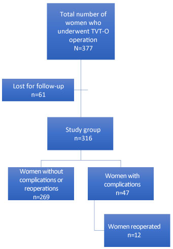 In the study period, 377 TVT-O operations were registered in the DugaBase. From these, 316 women (83.8%) were included in the follow-up (Figure 1). Sixty-one women (16.2%) were lost for follow-up. The mean follow-up period was 17 (3-65) months.
