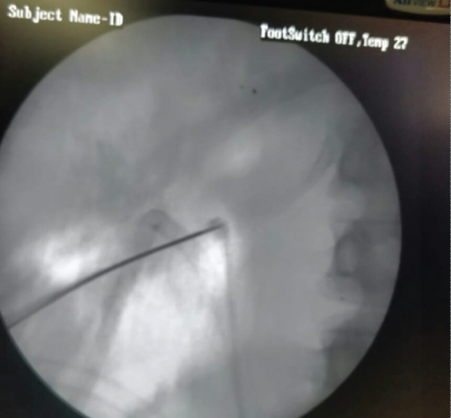 Figure 2: Fluoroscopic puncture made directly on the glide wire fragment.