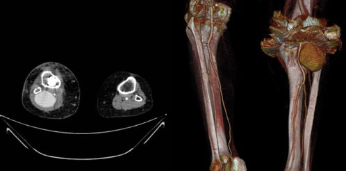 Figure 1: CT angiography image and 3D reconstruction showing the popliteal artery pseudoaneurysm.