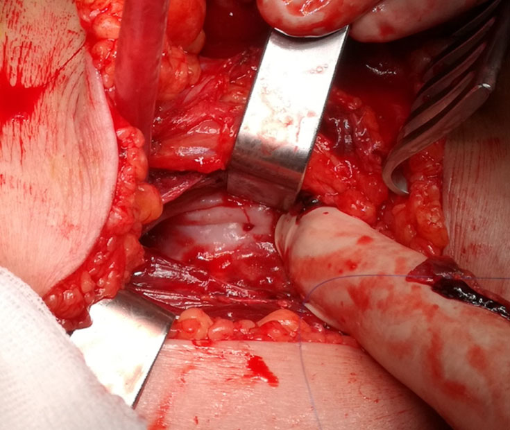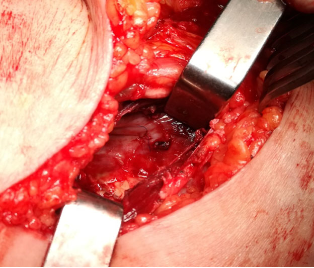 Pseudo endoaneurysmorrhaphy by lateral suturing of the popliteal artery by posterior incision was performed electively in the following month: The sack was opened posteriorly identifying the bleeding point (Figure 2). A lateral tear in the second portion of the popliteal artery was identified and repaired by a continuous lateral suture with monofilament 5/0 (Figure 3), verifying distal pulses. In the postoperative period, the patient evolved favourably with preserved distal pulses, improved symptomatology and there was no complication with the implant. She was discharged on the third postoperative day. The last review was 2 months after the intervention, the patient was asymptomatic, distal pulses were present and the ultrasound showed no recurrence data.