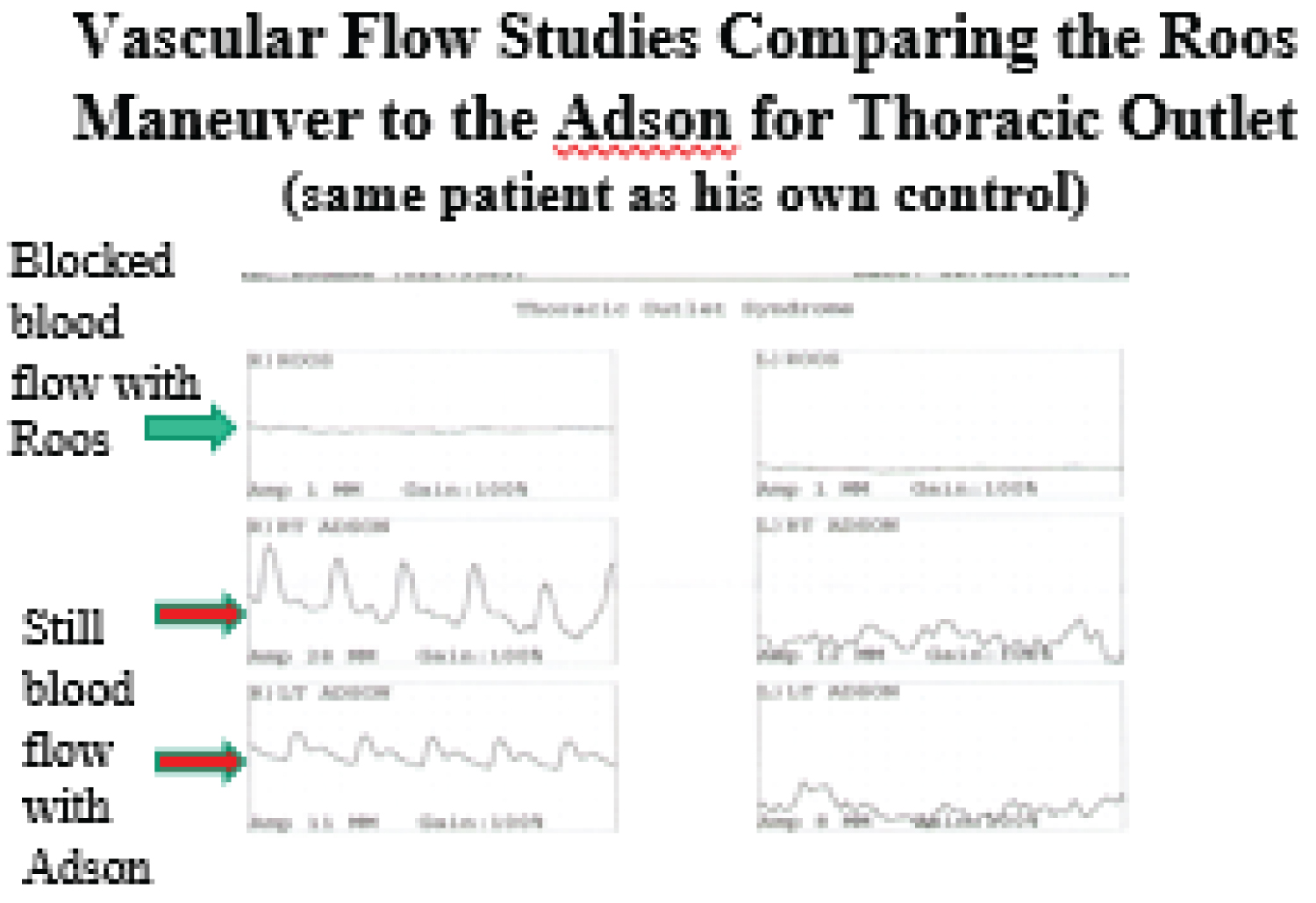 However, when vascular compression does accompany thoracic outlet syndrome, the Roos maneuver is a better test than the Adson maneuver, as demonstrated by vascular flow studies with the arms up and arms down, in the bruise position, compared to the Adson maneuver. Over 80% of the time, vascular compression will be demonstrated by the Roos maneuver, but missed by the Adson maneuver. Again, as is true with all sensory nerve damage, the neurometer studies are useful for detecting sensory nerve damage, and are especially valuable, if the studies are conducted when the patient has their arms in the Roos position, compared to being at rest [27] (Figure 3).