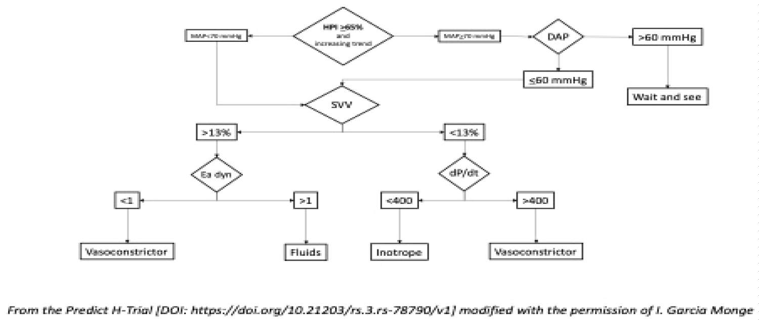 The Hemosphere TM (Edwards Lifescience Co., Irwin, CA, USA) platform provides the Hypotension Prediction Index (HPI), a predictive marker of blood pressure dropping within few minutes. HPI can predict a hypotension event (i.e. mean arterial pressure < 65 mmHg for 1 minute, at least) in a timeline of 5-15 min and it is based on 23 proprietary model features, derived from the analysis of the arterial wave [9]. Along with the HPI, other parameters are available: Cardiac output (CO), stroke volume (SV), both also indexed, pulse pressure variation (PPV), stroke volume variation (SVV) and the ratio between the two, named dynamic arterial Elastance (Ea dyn ). Ea dyn gives information about the left ventricle (LV) afterload and the ventriculo-arterial coupling. In addition, the slope of the arterial wave provides the dP/dt. This parameter has been demonstrated to be well correlated with the left ventricle (LV) elastance. As a result, dP/dt provides information about contractility of the heart [8-10]. Integrating all the parameters into a simple protocol may help the operator to prevent and/or correct the cause of hemodynamic instability.