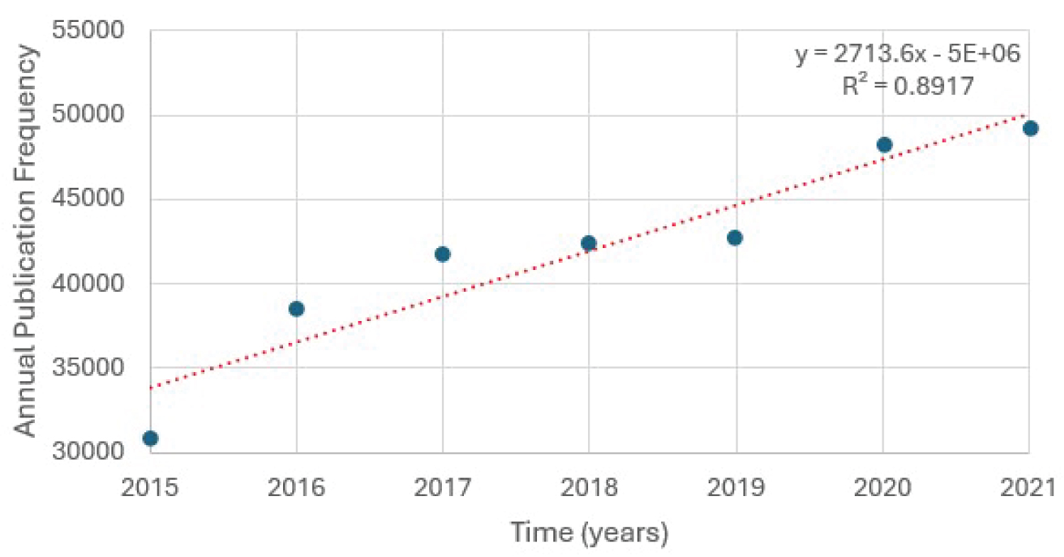 POCUS-related publication frequency (R 2 = 0.89, P < 0.05) on PubMed from 2015 to 2021 demonstrated a significant linear relationship with time. The number of POCUS-related publications peaked in 2021 at 49,236 (Figure 1).