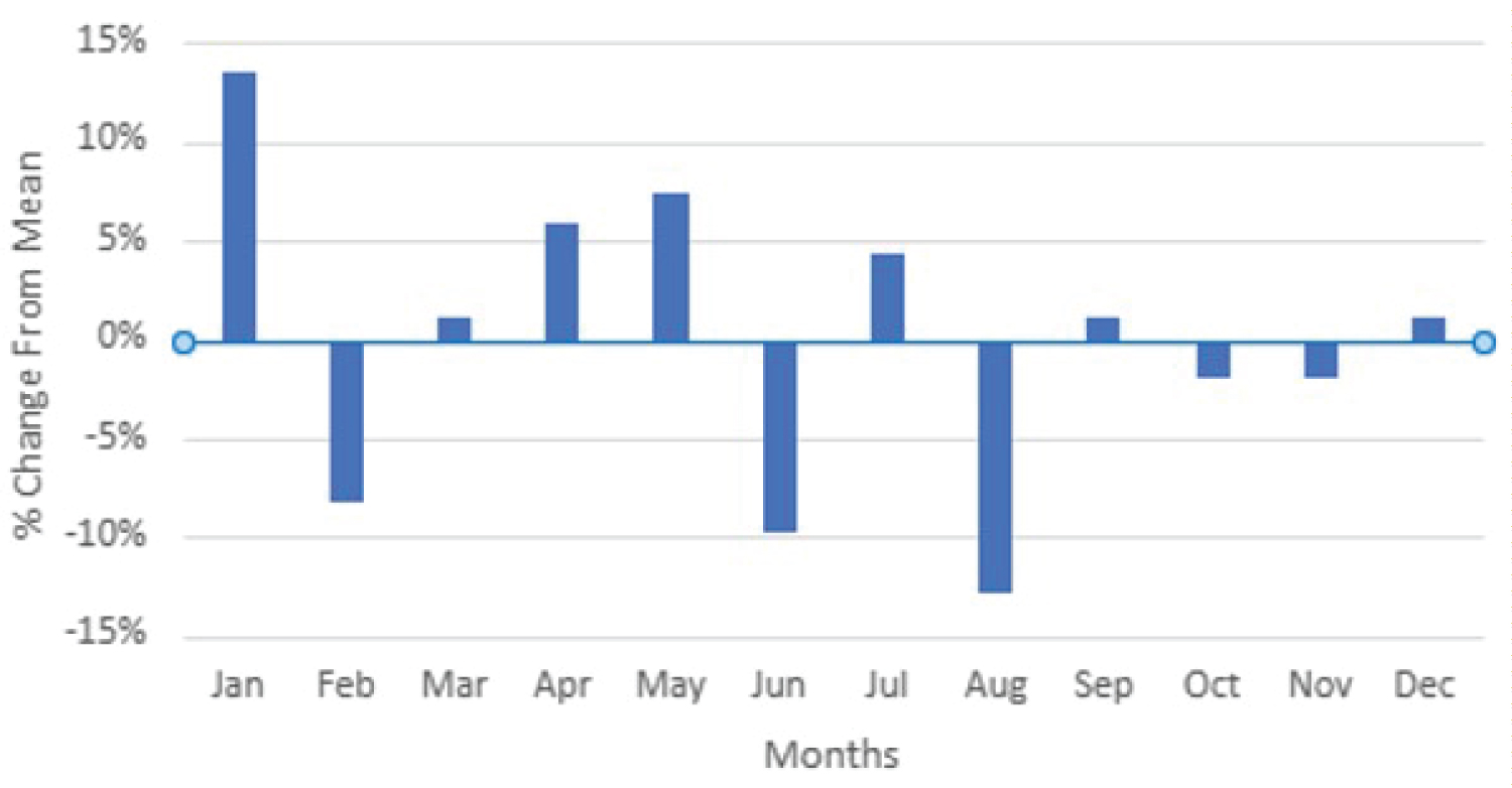 Temporal trends were analyzed by measuring the monthly deviation from the mean search volume for each significantly correlated search term. According to our findings, peak interest in point-of-care ultrasound and regional ultrasound occurred in January (+14%) and March (+11%), respectively. The greatest decline in interest for point-of-care ultrasound occurred in August (-13%). Both August (-11%) and September (-11%) data exhibited the least interest in regional ultrasound (Figure 2 and Figure 3).