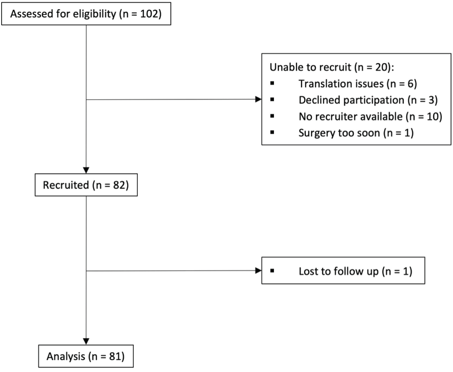 Between February 2021 and March 2022 there were 102 eligible participants, of which 82 participants consented and underwent the intervention. One participant was lost to follow-up, and 81 participants successfully completed the study (Figure 1). Baseline demographics, planned surgery, and medical history are shown in Table 1.