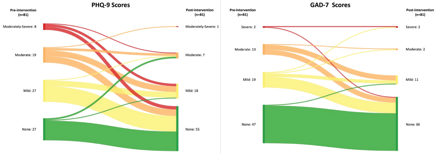 Figure 2: Sankey diagrams showing subgroup analysis based on severity of depression (PHQ-9 scores) pre- and post-intervention, p < 0.001 (left) and anxiety (GAD-7 scores) pre- and post-intervention, p < 0.001 (right).