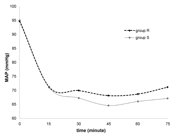 The demographic data, duration of anesthesia and total fluid volume were given in table 3. No significant differences were found in age, body mass index or duration of anesthesia between two groups. Mean arterial pressure values were shown at Graphic 1. No statistically difference was observed at minutes 0, 15, 30, 45, 60 and 75 between groups .(P: respectively 0.97, 0.45, 0.31, 0.14, 0.13, 0.11) When comparing between two groups edema scores were no statistically significant difference at 4, 24 hours and 7 days postoperatively.