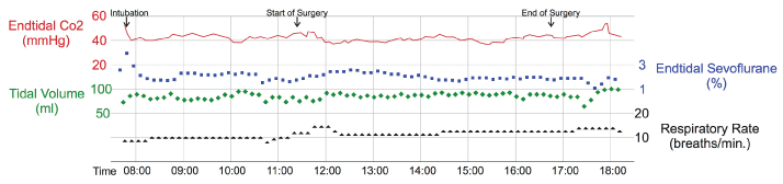 Anesthesia was induced under standard non-invasive monitoring (blood pressure, ECG, pulse oximetry) with midazolam, fentanyl and ketamin-s followed by rocuronium. While bag-valve mask ventilation was unremarkable, endotracheal intubation by direct laryngoscopy was not feasible. Therefore, the airway was immediately secured by fiberoptic intubation. Anesthesia was maintained with sevoflurane and remifentanil. Pressure-controlled ventilation with an inspiratory oxygen fraction of 0.35, a respiratory rate of 16-18/min and an inspiration: expiration ratio of 1:2.5-3.0 was chosen. Positive end-expiratory pressure was limited to 5 mmHg and tidal volume was adjusted to maintain normocapnia (Figure 1).