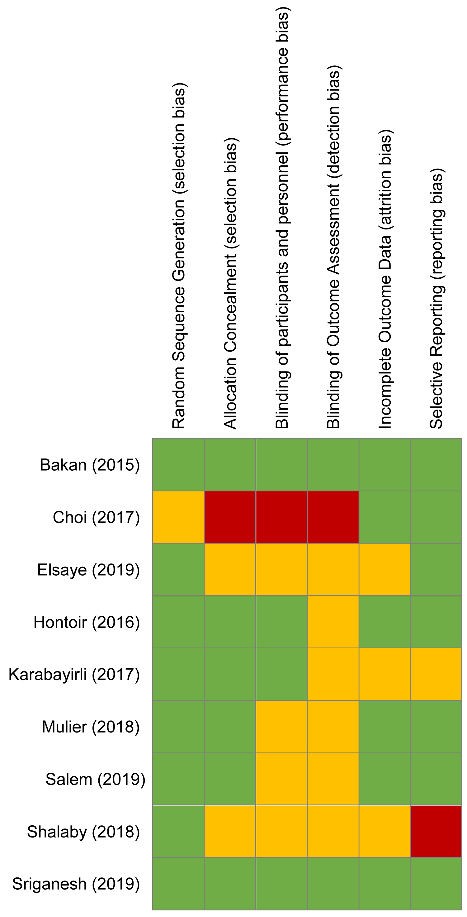 Figure 3: Cochrane Collaboration risk of bias summary of included clinical trials. Green circle, low risk of bias; red circle, high risk of bias; yellow circle, unclear risk of bias.