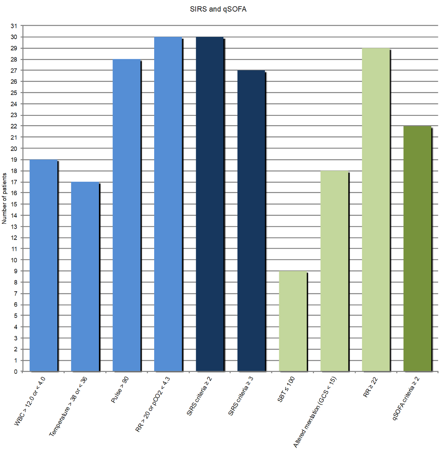 We retrospectively studied qSOFA and SIRS criteria in a previously described cohort of all adult patients with severe pneumococcal sepsis admitted to the Medical Intensive Care Unit at Oslo University Hospital Ullevaal. This cohort consists of 38 patients that were included in an eight-year period (01/01/2006-12/31/2013). The inclusion criteria were growth of Streptococcus pneumoniae in blood culture and respiratory failure treated with invasive mechanical ventilation, thus fulfilling the definition of severe sepsis. Data to assess the sensitivity of the SIRS - and the qSOFA criteria on admission was available in 31 of 38 patients. Outcome was measured as number of patients that fulfilled the criteria for sepsis on admission, defined by the three following groups: SIRS ≥ 2/4, SIRS ≥ 3/4 and qSOFA ≥ 2/3.