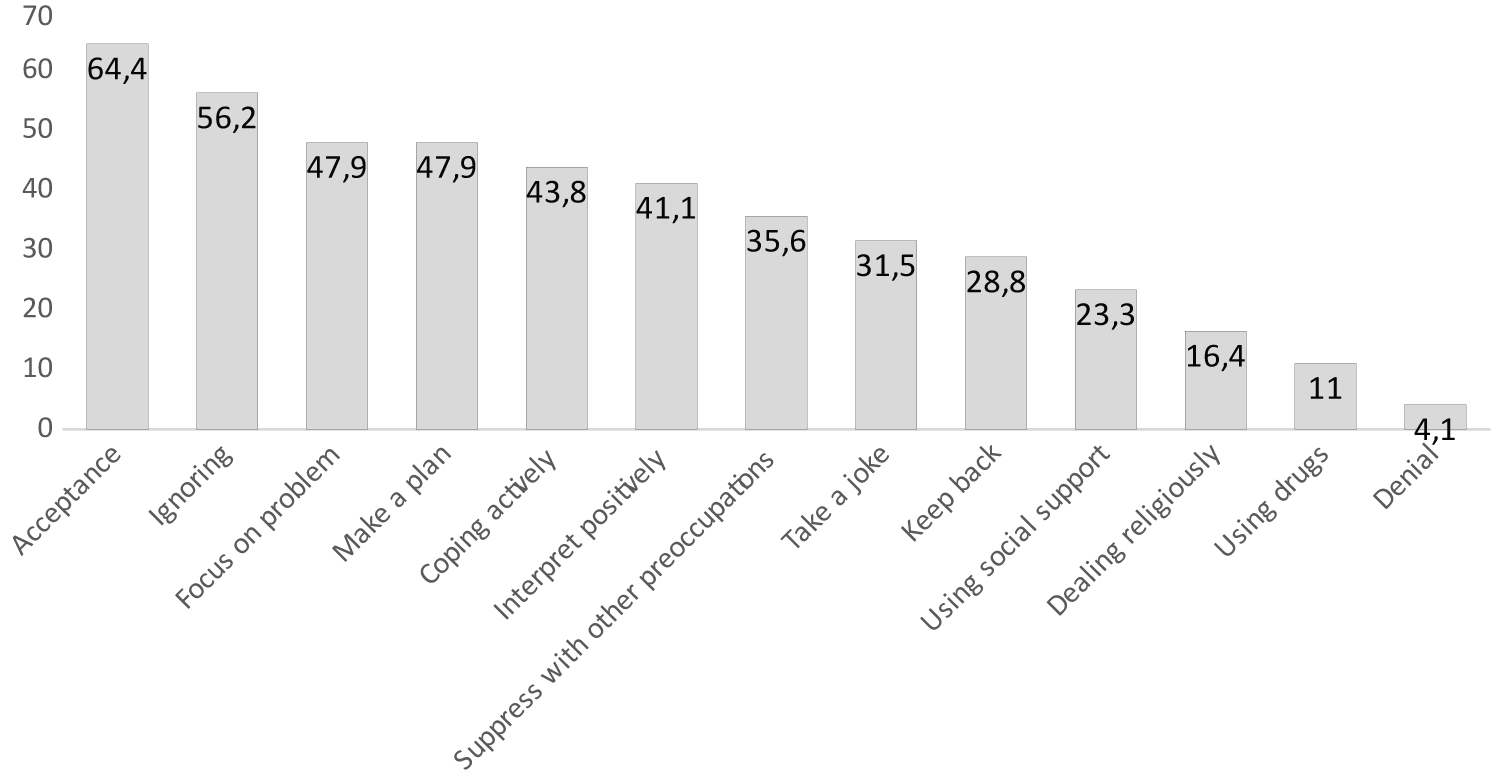People who are exposed to stress use various coping methods to restore their mental balance. These methods are also defined as cognitive and behavioral efforts [29]. Lazarus and Folkman reported that coping is a dynamic process and changes during stressful interactions between the person and her/his environment [30]. In dealing with stress, people generally use three strategies. These are problem-focused, emotion-focused, and thought-focused coping methods [31]. Most of the participants in our study preferred the “acceptance” method (64.4%) as a strategy to cope with stress. This was followed by methods of ignoring (56.2%), focusing on the problem and planning (47.9%), respectively. The denial method (4.1%) was the least preferred method. When the relationship between gender and methods of coping with stress was examined, a different result was observed in women with a rate of denial (12.5%), while this method was never used in men. In men, acceptance was statistically significantly higher than in women.