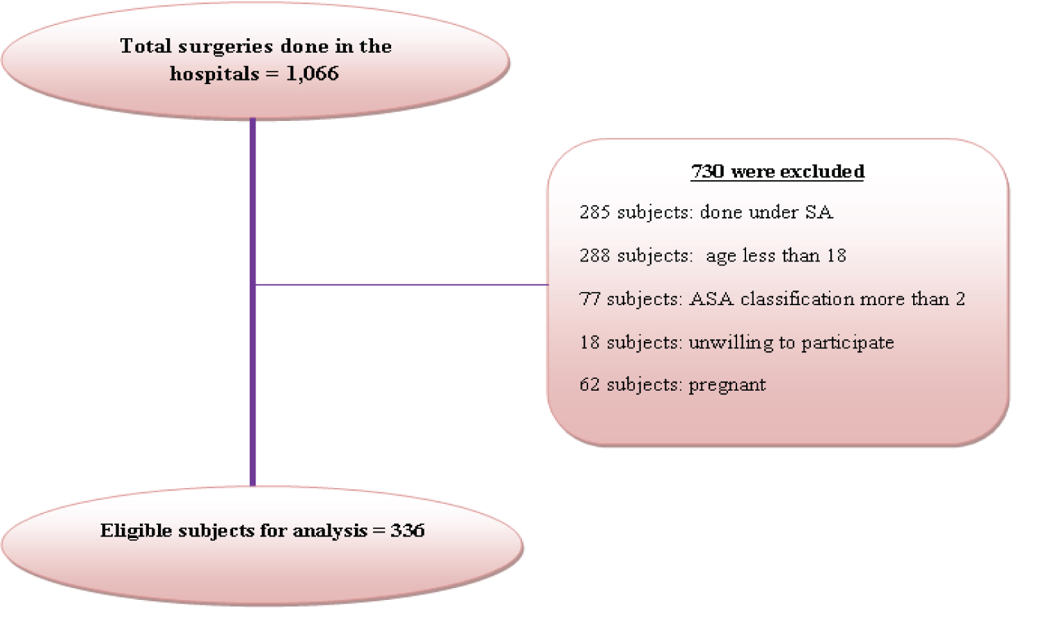 All adult patients, who visited the selected hospitals during the study period (from June 1st 2018 to September 30th 2018) for surgical intervention under general anesthesia using endotracheal intubation technique, were the study population. All patients who visited the hospitals fulfilling the inclusion criteria were taken as participants in this study. All patients aged 18 years and above who underwent surgeries under general anesthesia using endotracheal intubation technique, with ASA classification of two and less than two, were included in the study. The exclusion criteria for participation were when patients were unwilling to participate, unable to communicate due to critical illness (Comatose, semiconscious, etc…), with an acute upper respiratory infection or with a sore throat before, underwent oro-laryngeal surgery, pregnant mothers and those with a history of psychiatric disorder and currently receiving psychological treatment or sedative, antidepressant, or antianxiety medications (Figure 1).