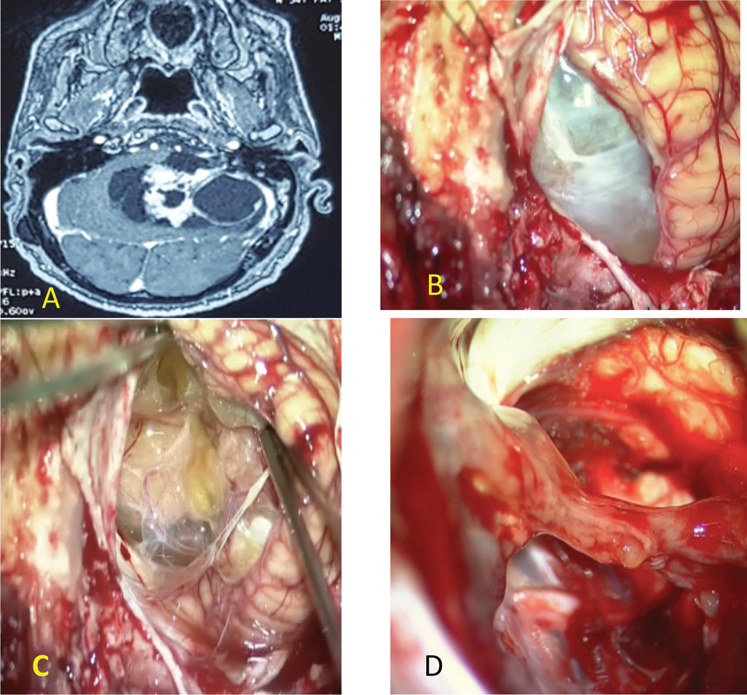 Figure 2: (A) MRI of giant cystic VS type B (PC); (B) Evidence of the cyst wall after cerebellum retraction; (C) anatomic preservation of facial and cochlear nerve and a thin layer of tumor was left over the facial nerve; (D) postoperative MRI showing near total resection of cystic VS.
