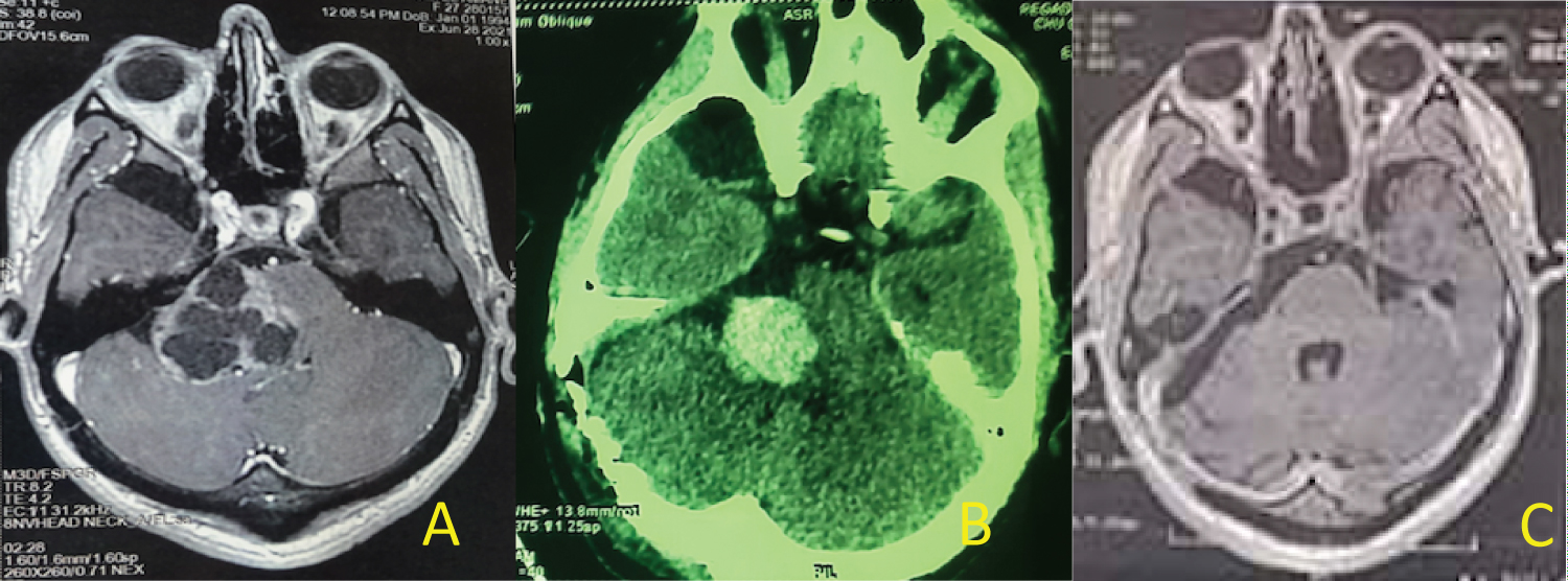 Figure 3: (A) MRI of giant cyst VS; (B) CT scan: Postoperative hematoma; (C) Postoperative MRI with great total tumor resection.