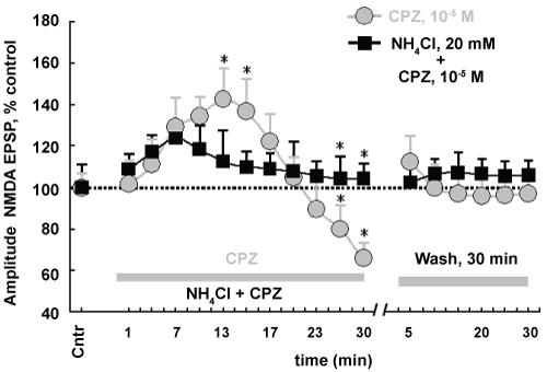 To solve the issue negative effects of CPZ on the both AMPA and NMDA-dependent mechanisms the experiment was carried out in the presence of "lysosomal inhibitor", ammonium chloride. This compound (Na+/H+-ionophore) is commonly recognized as fast and efficient lysosomal inhibitor [18]. Lysosomal trapping is an important mechanism of cellular and body distribution of basic psychotropic drugs, such as phenothiazine neuroleptics [19]. We hypothesised that ammonium chloride reduces the high lipophilicity of CPZ and protects deterioration NMDAR functions.