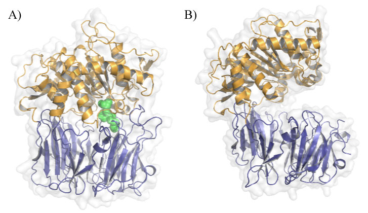 Figure 1: POP conformations in solution. A) Closed conformation of porcine POP (PDB ID: 1QFS) covalently bound to inhibitor Z-pro-prolinal (ZPP), the first POP inhibitor to be designed. β-propeller is shown in blue, α/β-hydrolase domain in orange and ZPP in green; B) Open conformation of Aemonas punctate POP (PDB ID: 3IUJ). View Figure 1