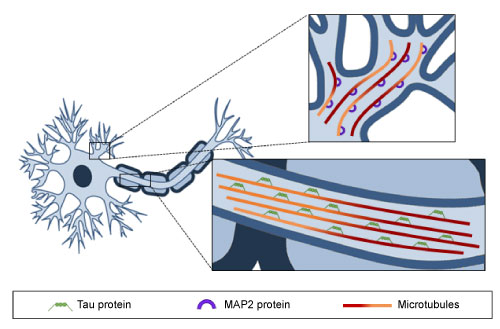 Figure 2: Microtubule distribution along axons and dendrites. MTs are oriented uniformly in axons and Tau protein is the predominant MAP, whereas in dendrites MTs show a mixed orientation and MAP2 protein is bound to them. View Figure 2