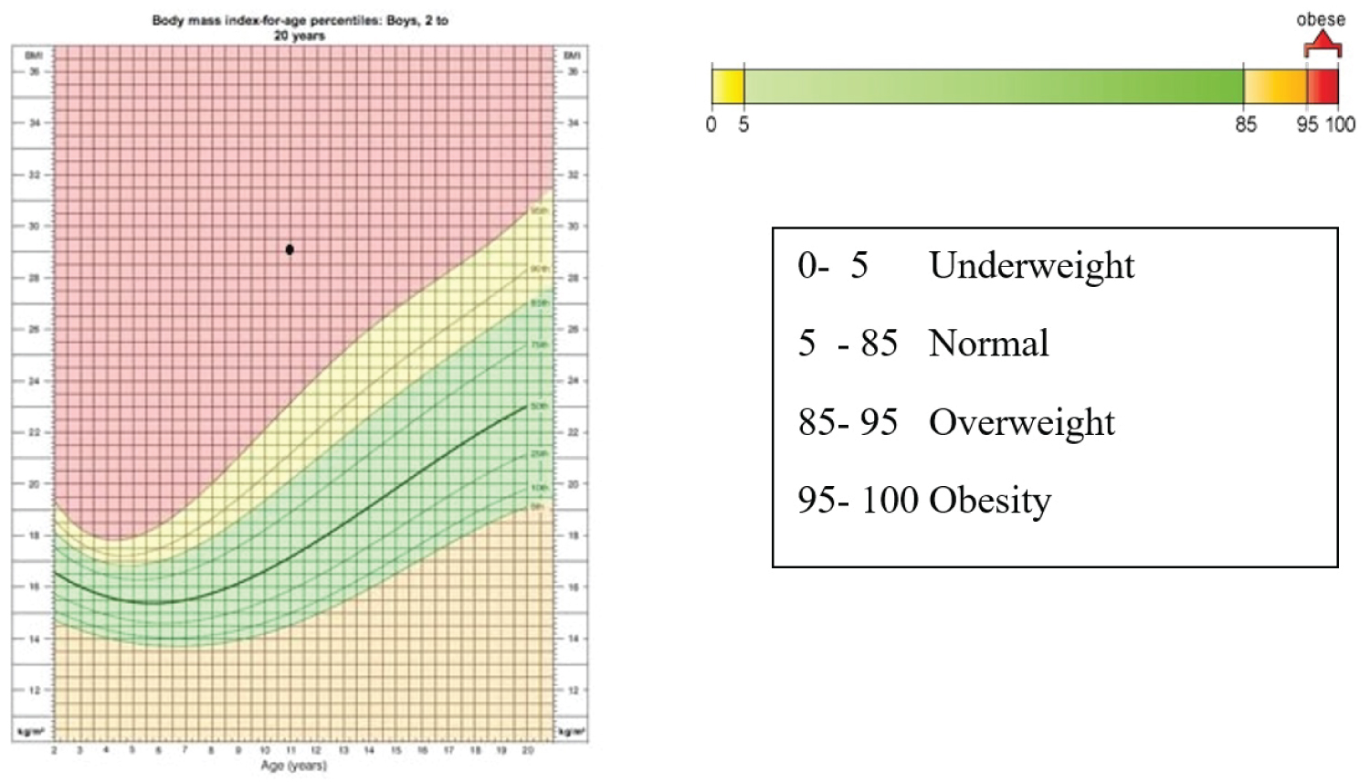 An 11-years-old male child was admitted to the pediatric department with chief complain of weakness and clumsiness persisted of the right hand and leg, mild headache, and dysarthria for 6 weeks ago. Physical examination revealed that patient was conscious, all vital sign was normal, but body mass index (BMI) was 29.3 (weight 68 kg, height 154 cm). CDC curve showed that his BMI is over than 95th percentiles by his age - 11 years, and classified in obesity (Figure 1).