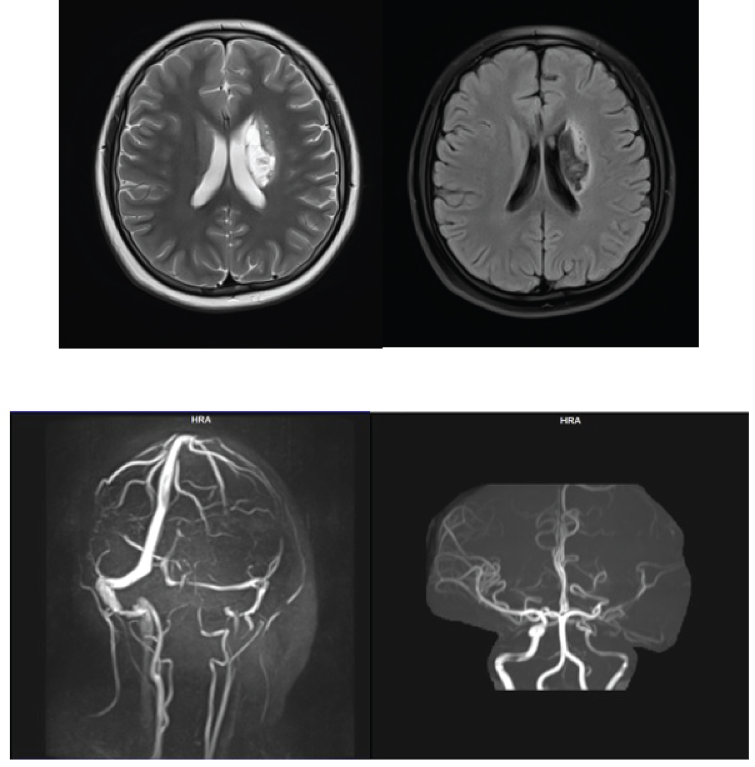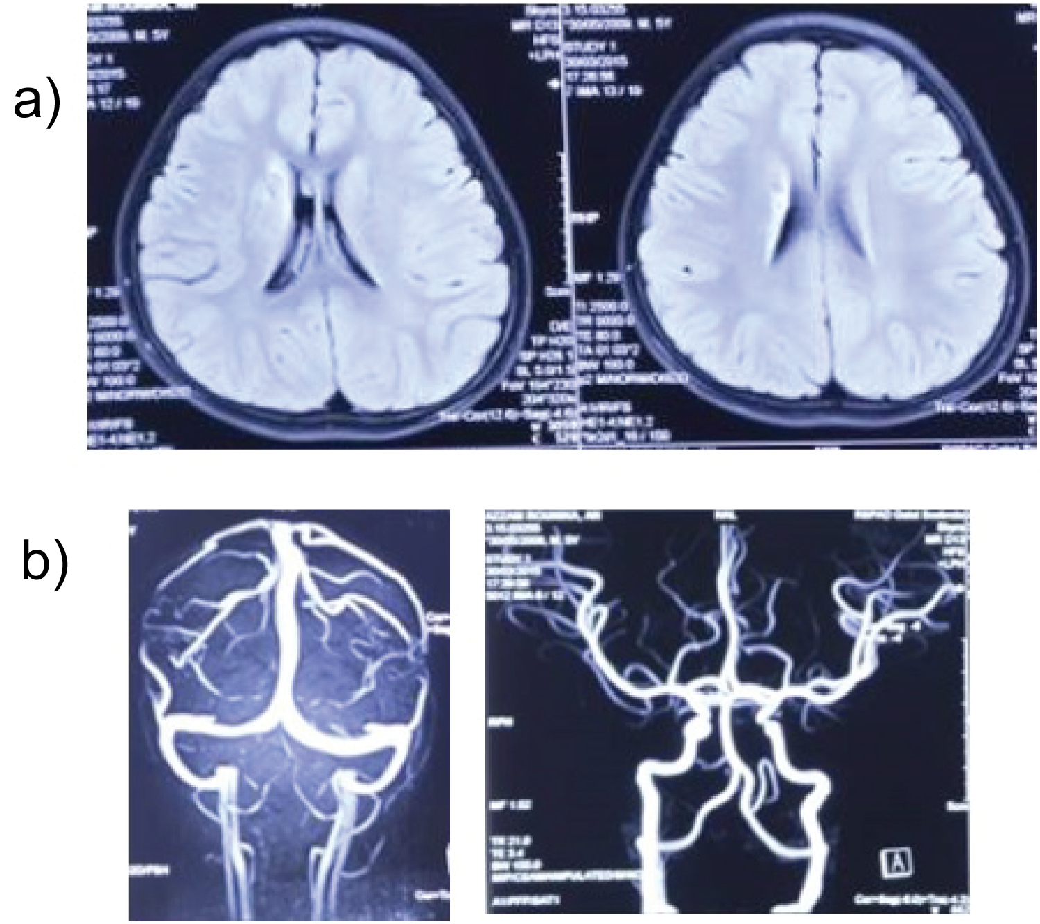 Figure 5: Brain MR imaging (a) FLAIR sequence with infarct lesion in right base of ganglia and lateral periventricular; (b) MRV and MRA imaging within normal.
