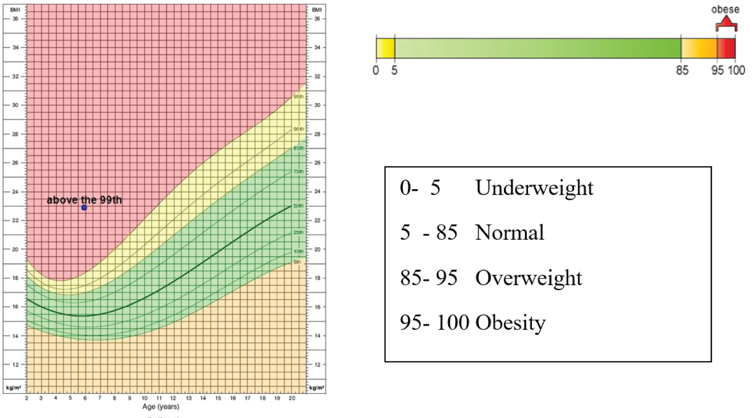 On physical examination, we found the patient was conscious and verbal communication was within normal. Blood pressure was elevated for his age at 120/70 mmHg. The patient's systolic blood pressure was in the 99th percentile and diastolic blood pressure was higher than the 95th percentiles in comparison to patients that were 5-years-old in the general population. His body weight was 33 kg and height 120 cm with a BMI 22.9. CDC curve showed that his BMI was over than 99 percentiles by his age 5 years and 11 months, therefore he is classified as obese (Figure 4).