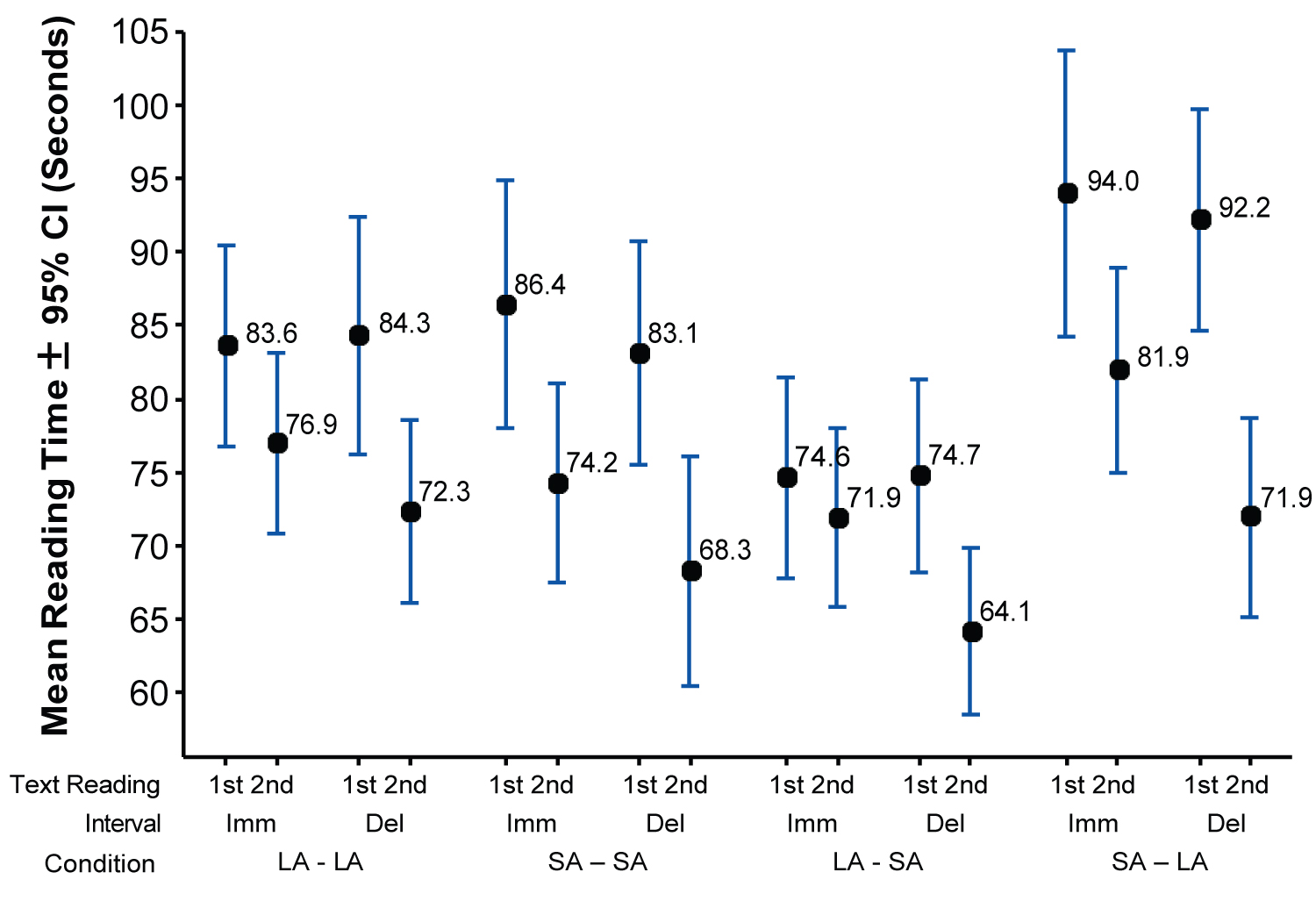 Within each of the four conditions and the two intervals, the overall reading times for the first text (M = 84.1, 95% CI = 81.4, 86.8) were longer than the second (M = 72.6, 95% CI = 70.4, 75.00). The longest reading times were in the SA-LA condition for the first measure of both the immediate (M = 94.0, 95% CI = 84.2, 103.8) and delayed (M = 92.2, 95% CI = 84.7, 99.7) groups. The shortest times were for the second measure of the delayed group in the SA-SA (M = 68.3, 95%, CI = 60.4, 76.1) and LA-SA (M = 64.1, 95% CI = 58.4, 69.8) conditions.